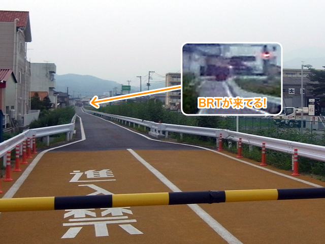 普通の踏切と違って、BRT側に遮断機があるんだ。