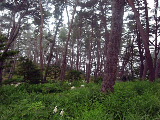 霞がかった松林の中で所々に咲く白ユリ・・・・幻想的・・・